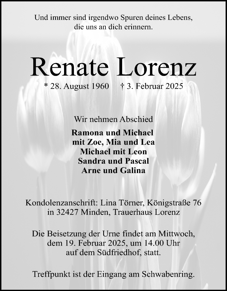 Hier finden Sie alle Traueranzeigen aus der Zeitung, die bisher für Renate Lorenz erschienen sind. Weitere Traueranzeigen, die in der Zeitung erscheinen, werden hier ebenfalls aufgelistet