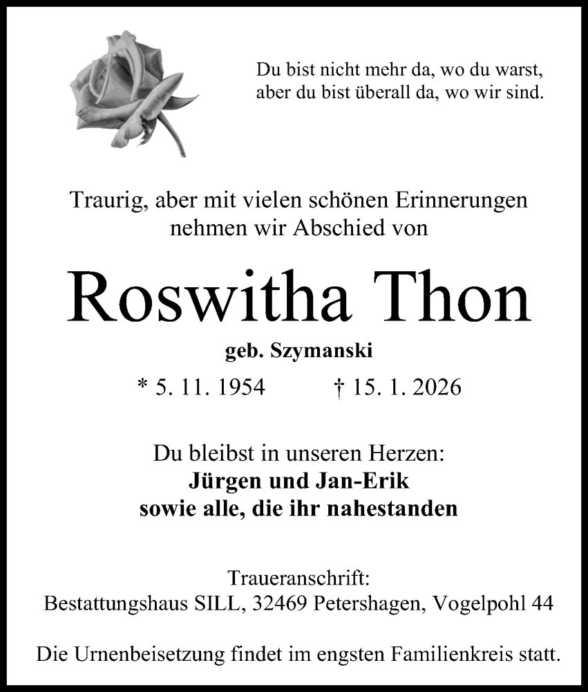 Hier finden Sie alle Traueranzeigen aus der Zeitung, die bisher für Roswitha Thon erschienen sind. Weitere Traueranzeigen, die in der Zeitung erscheinen, werden hier ebenfalls aufgelistet