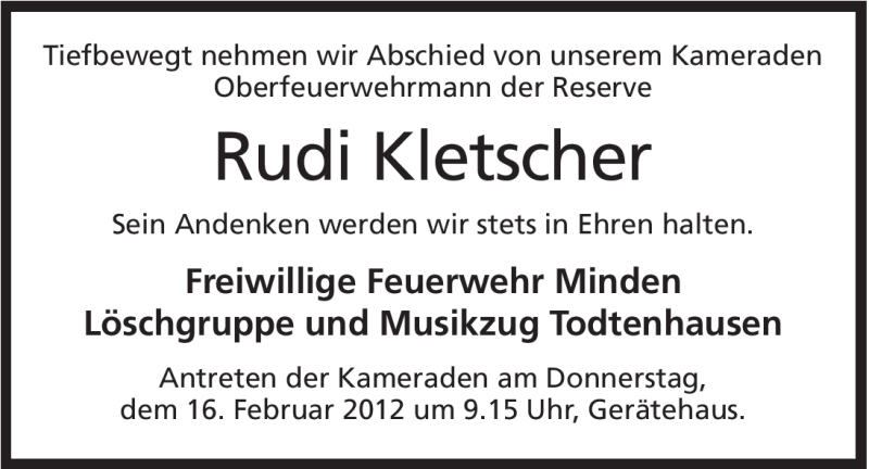 Hier finden Sie alle Traueranzeigen aus der Zeitung, die bisher für Rudi Kletscher erschienen sind. Weitere Traueranzeigen, die in der Zeitung erscheinen, werden hier ebenfalls aufgelistet