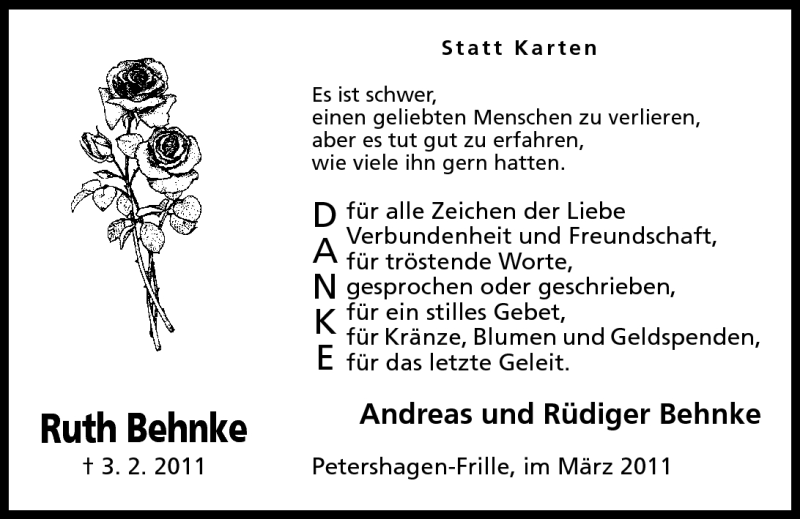 Hier finden Sie alle Traueranzeigen aus der Zeitung, die bisher für Ruth Behnke erschienen sind. Weitere Traueranzeigen, die in der Zeitung erscheinen, werden hier ebenfalls aufgelistet