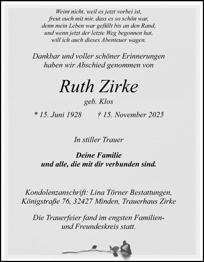 Hier finden Sie alle Traueranzeigen aus der Zeitung, die bisher für Ruth Zirke erschienen sind. Weitere Traueranzeigen, die in der Zeitung erscheinen, werden hier ebenfalls aufgelistet