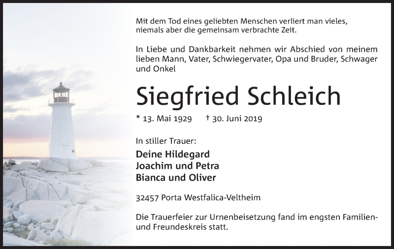 Hier finden Sie alle Traueranzeigen aus der Zeitung, die bisher für Siegfried Schleich erschienen sind. Weitere Traueranzeigen, die in der Zeitung erscheinen, werden hier ebenfalls aufgelistet