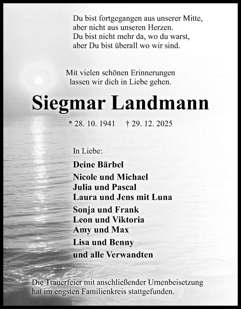 Hier finden Sie alle Traueranzeigen aus der Zeitung, die bisher für Siegmar Landmann erschienen sind. Weitere Traueranzeigen, die in der Zeitung erscheinen, werden hier ebenfalls aufgelistet