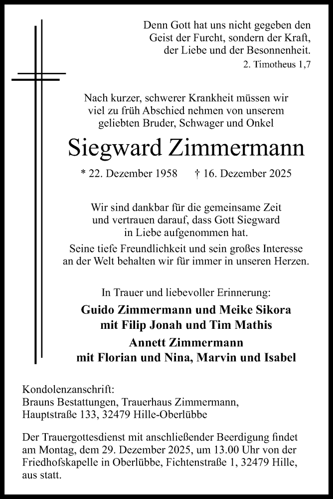 Hier finden Sie alle Traueranzeigen aus der Zeitung, die bisher für Siegward Zimmermann erschienen sind. Weitere Traueranzeigen, die in der Zeitung erscheinen, werden hier ebenfalls aufgelistet