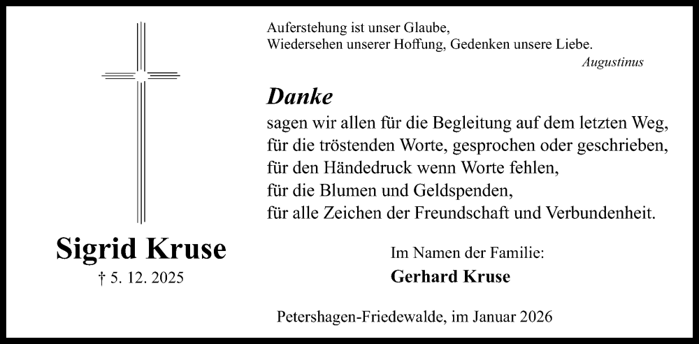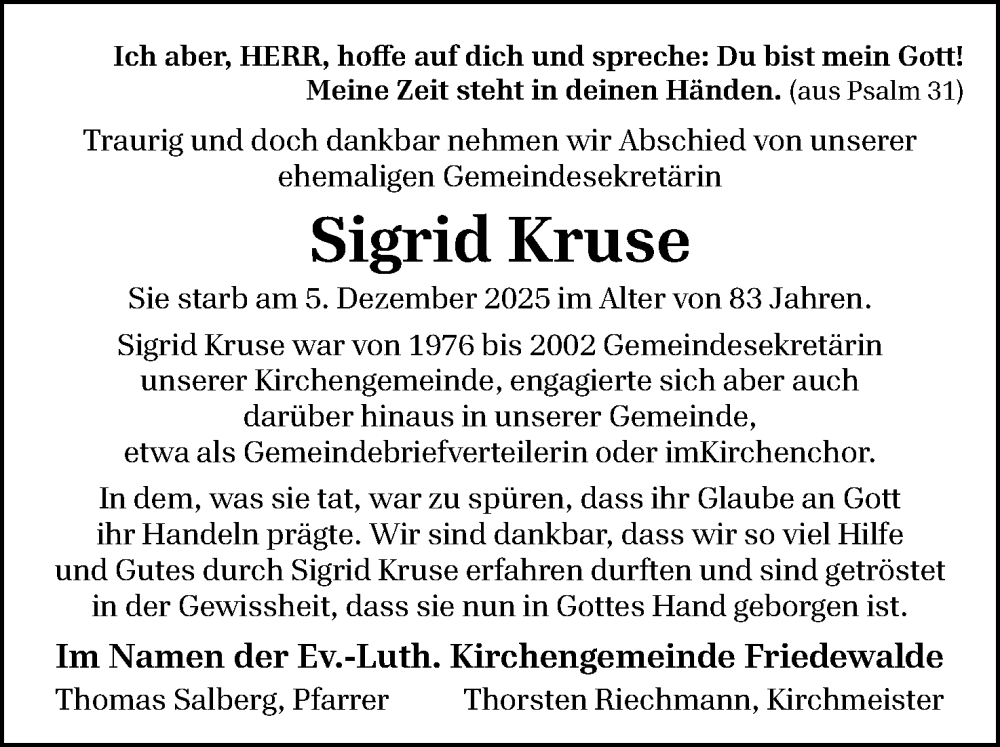 Hier finden Sie alle Traueranzeigen aus der Zeitung, die bisher für Sigrid Kruse erschienen sind. Weitere Traueranzeigen, die in der Zeitung erscheinen, werden hier ebenfalls aufgelistet