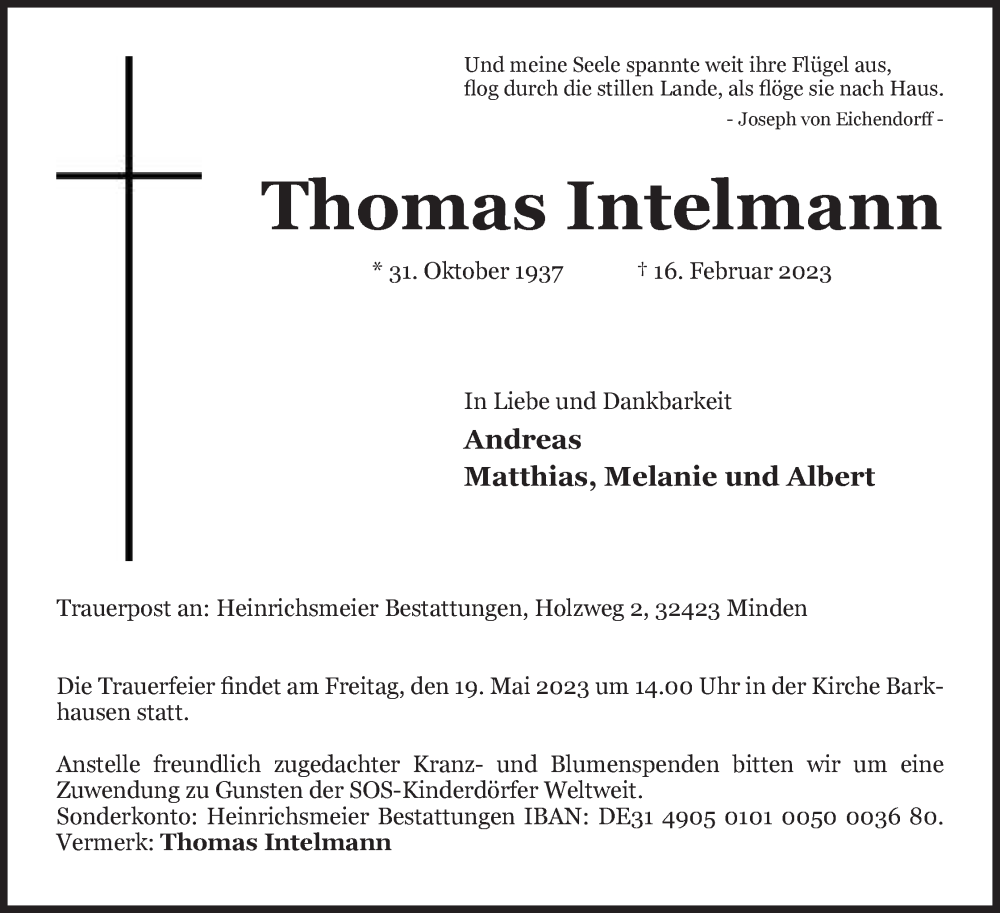 Hier finden Sie alle Traueranzeigen aus der Zeitung, die bisher für Thomas Intelmann erschienen sind. Weitere Traueranzeigen, die in der Zeitung erscheinen, werden hier ebenfalls aufgelistet