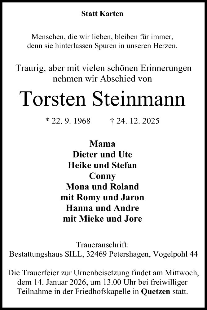 Hier finden Sie alle Traueranzeigen aus der Zeitung, die bisher für Torsten Steinmann erschienen sind. Weitere Traueranzeigen, die in der Zeitung erscheinen, werden hier ebenfalls aufgelistet