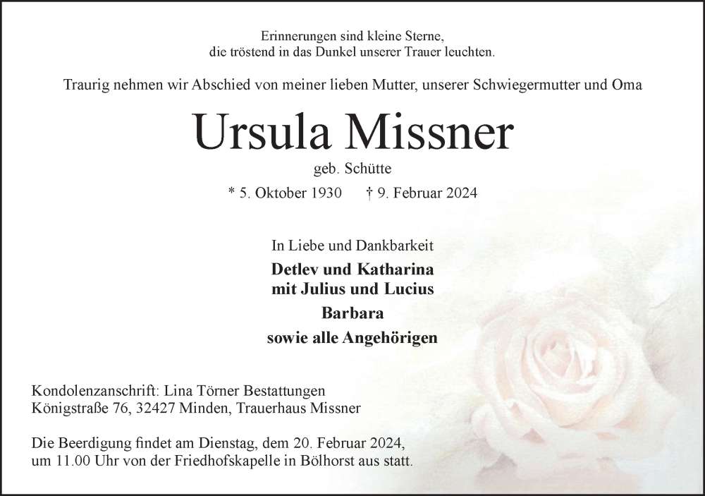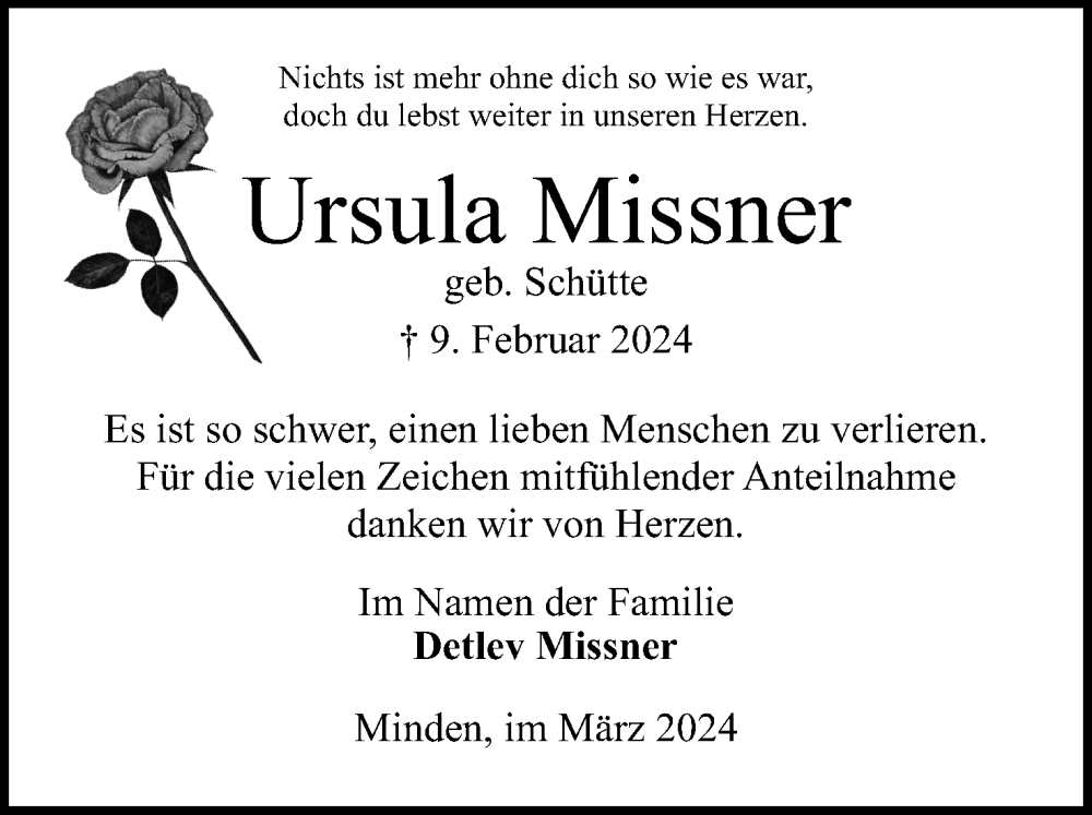 Hier finden Sie alle Traueranzeigen aus der Zeitung, die bisher für Ursula Missner erschienen sind. Weitere Traueranzeigen, die in der Zeitung erscheinen, werden hier ebenfalls aufgelistet