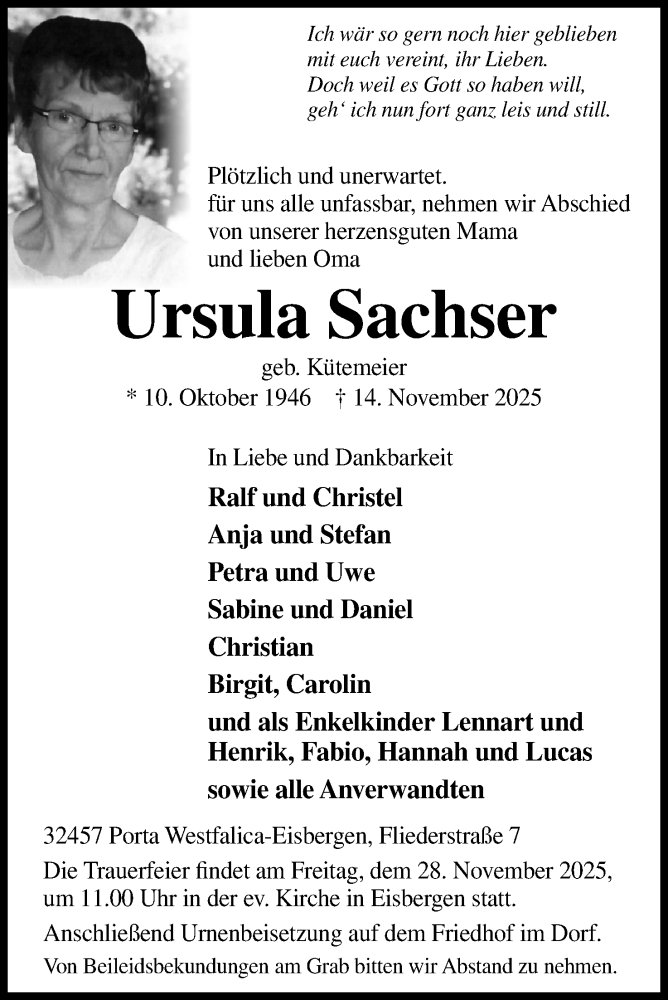 Hier finden Sie alle Traueranzeigen aus der Zeitung, die bisher für Ursula Sachser erschienen sind. Weitere Traueranzeigen, die in der Zeitung erscheinen, werden hier ebenfalls aufgelistet