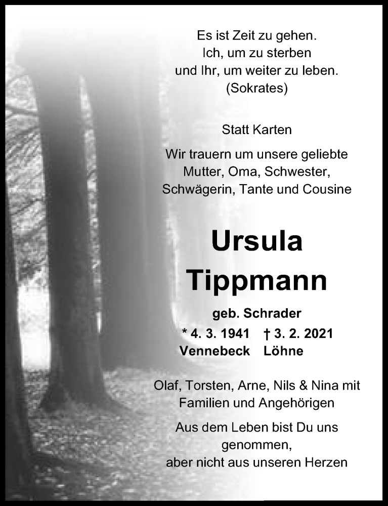 Hier finden Sie alle Traueranzeigen aus der Zeitung, die bisher für Ursula Tippmann erschienen sind. Weitere Traueranzeigen, die in der Zeitung erscheinen, werden hier ebenfalls aufgelistet