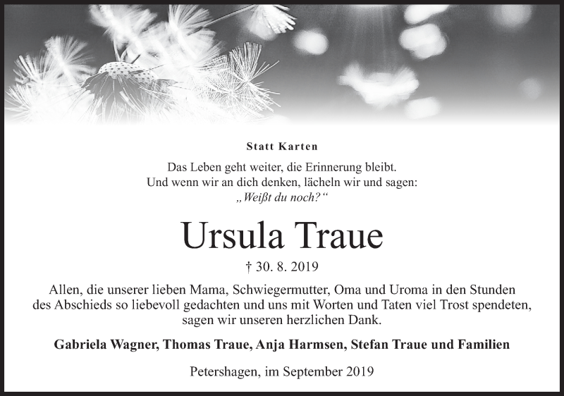 Hier finden Sie alle Traueranzeigen aus der Zeitung, die bisher für Ursula Traue erschienen sind. Weitere Traueranzeigen, die in der Zeitung erscheinen, werden hier ebenfalls aufgelistet