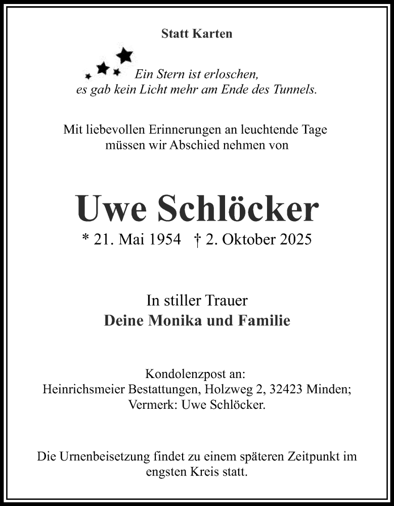 Hier finden Sie alle Traueranzeigen aus der Zeitung, die bisher für Uwe Schlöcker erschienen sind. Weitere Traueranzeigen, die in der Zeitung erscheinen, werden hier ebenfalls aufgelistet