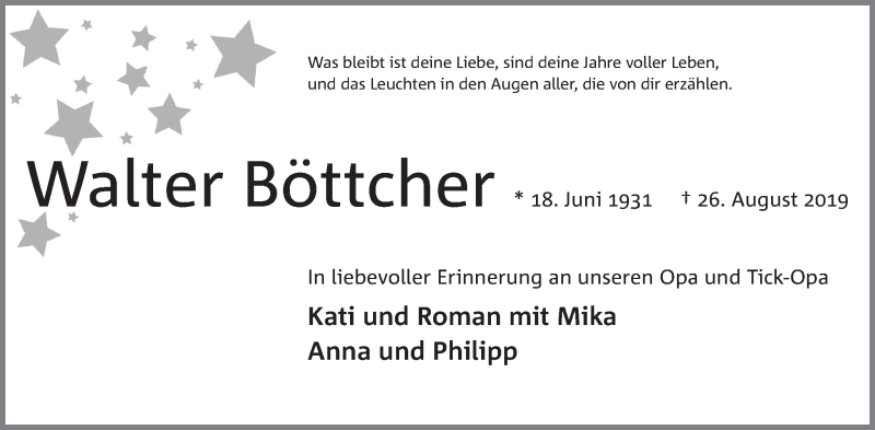 Hier finden Sie alle Traueranzeigen aus der Zeitung, die bisher für Walter Böttcher erschienen sind. Weitere Traueranzeigen, die in der Zeitung erscheinen, werden hier ebenfalls aufgelistet