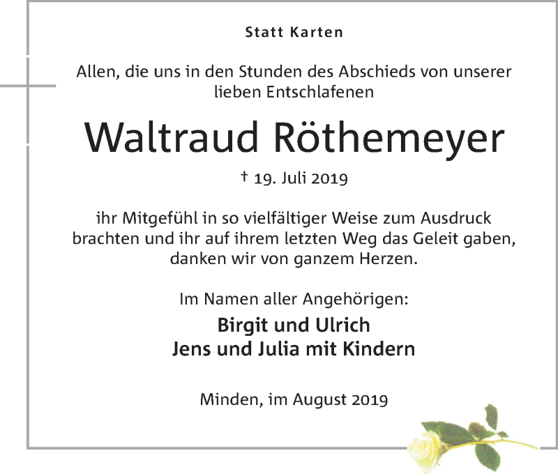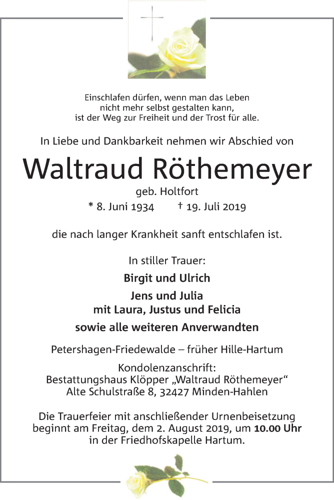 Hier finden Sie alle Traueranzeigen aus der Zeitung, die bisher für Waltraud Röthemeyer erschienen sind. Weitere Traueranzeigen, die in der Zeitung erscheinen, werden hier ebenfalls aufgelistet