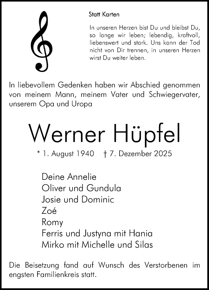 Hier finden Sie alle Traueranzeigen aus der Zeitung, die bisher für Werner Hüpfel erschienen sind. Weitere Traueranzeigen, die in der Zeitung erscheinen, werden hier ebenfalls aufgelistet