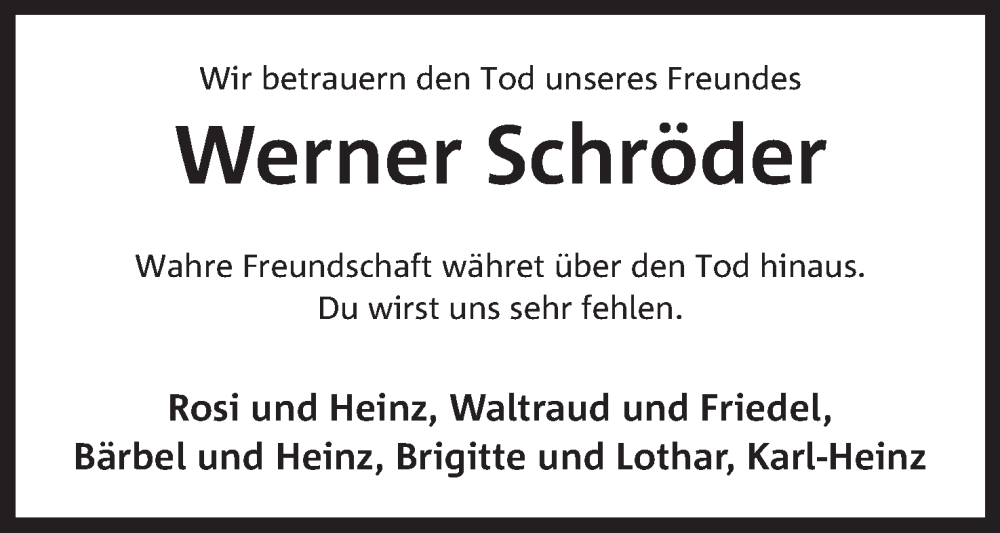 Hier finden Sie alle Traueranzeigen aus der Zeitung, die bisher für Werner Schröder erschienen sind. Weitere Traueranzeigen, die in der Zeitung erscheinen, werden hier ebenfalls aufgelistet