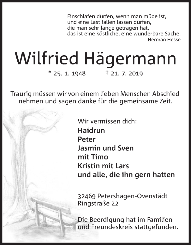 Hier finden Sie alle Traueranzeigen aus der Zeitung, die bisher für Wilfried Hägermann erschienen sind. Weitere Traueranzeigen, die in der Zeitung erscheinen, werden hier ebenfalls aufgelistet