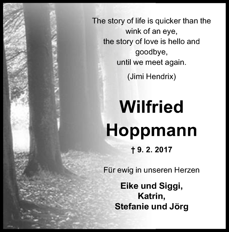 Hier finden Sie alle Traueranzeigen aus der Zeitung, die bisher für Wilfried Hoppmann erschienen sind. Weitere Traueranzeigen, die in der Zeitung erscheinen, werden hier ebenfalls aufgelistet