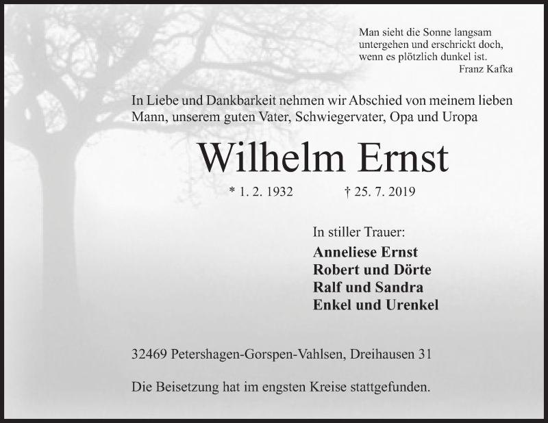 Hier finden Sie alle Traueranzeigen aus der Zeitung, die bisher für Wilhelm Ernst erschienen sind. Weitere Traueranzeigen, die in der Zeitung erscheinen, werden hier ebenfalls aufgelistet